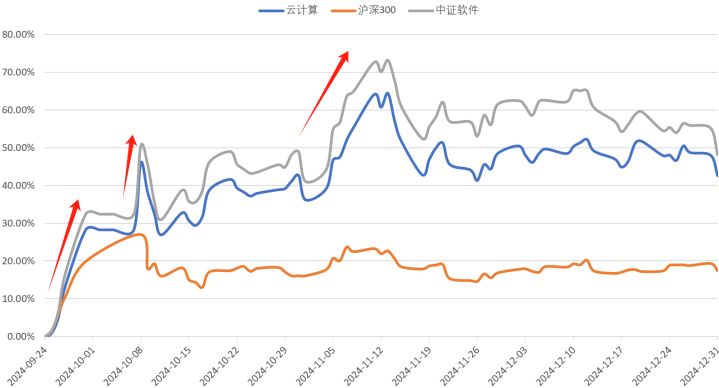 比如去年924行情,云计算ETF(159890)和软件龙头ETF(159899)跟踪的中证云计算与大数据主题指数(930851)和中证软件服务指数(930601),基本上涨起来就是直线拉升,很难在上行行情中找到相对低位的介入节点。
